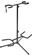Soporte de guitarra de acero plegable con altura ajustable y gran estabilidad que puede acomodar hasta dos guitarras o bajos. Las superficies de contacto de espuma y los manguitos de goma de seguridad proporcionan protección contra daños mecánicos causados por caídas o arañazos. De color negro.